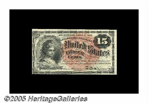 <B>Fr. 1267 Milton 4R15.2 15¢ Fourth Issue Choice New.</B></I> A perfect Gem but for the centering. Included with the note is an early collector envelope indicating that it was obtained from Ed Frossard on February 8, 1898.