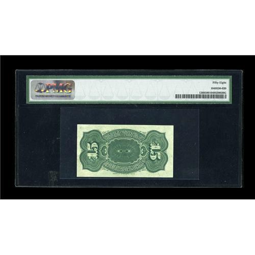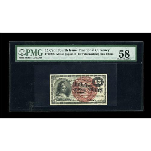 <B>Fr. 1268 15c Fourth Issue PMG Choice About Unc 58.</B></I> This is the far rarer variety without the USUSUS watermark. This note has enormous margins, perfect face centering and robust ink colors. This is a real beauty which faces up as a superb gem and upon viewing the note through the holder at virtually every angle we cannot find even a hint of circulation. This is a rare number and with a bright and flawless example such as this that does not have even a trace of a watermark the attribution is rather easy. The few auction records that exist for this variety prove that even for a nice AU a four figure price is in order and with its outstanding eye appeal it could realize a runaway price.<BR><BR><b>Shipping:</b> Coins & Currency (<a target="_blank" href="http://www.heritageauctions.com/common/shipping.php">view shipping information</a>)