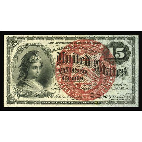 <B>Fr. 1269 15¢ Fourth Issue Gem New.</B></I> A bright and pretty note, with an exceptionally bold printed red seal and bright blue end paper. This example would be Superb if the top face margin, which is more than adequate for Gem, were the size of the other three jumbo margins.
