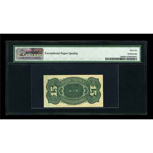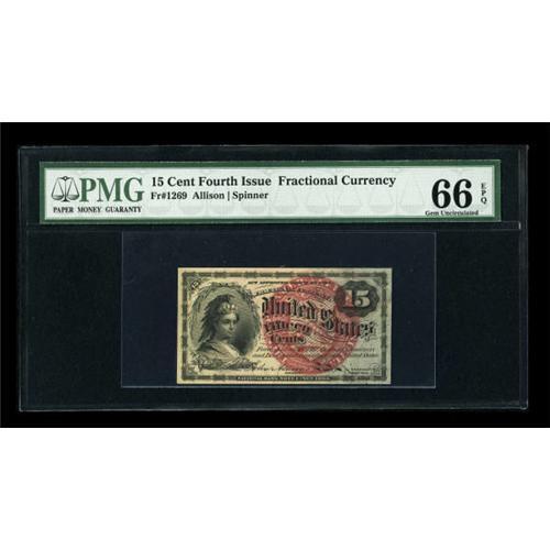 <B>Fr. 1269 15c Fourth Issue PMG Gem Uncirculated 66 EPQ.</B></I> Fr. 1269 is both a somewhat more difficult number and, in this cataloger's opinion, the most handsome of the 15¢ varieties. PMG has only graded 3 at this level, with one higher. <BR><BR><b>Shipping:</b> Coins & Currency (<a target="_blank" href="http://www.heritageauctions.com/common/shipping.php">view shipping information</a>)