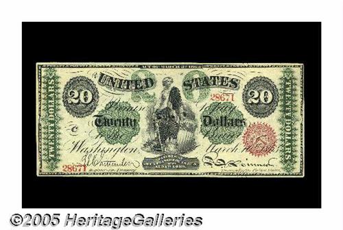 <B>Fr. 126b $20 1863 Legal Tender New.</B></I> There are a few light handling wrinkles and one corner is slightly rounded on this fresh and original example, which enjoys premium centering and is free from the tiny splits which often plague the brittle paper on which this design was printed. Our estimate may prove conservative given the evident originality of the paper surfaces.