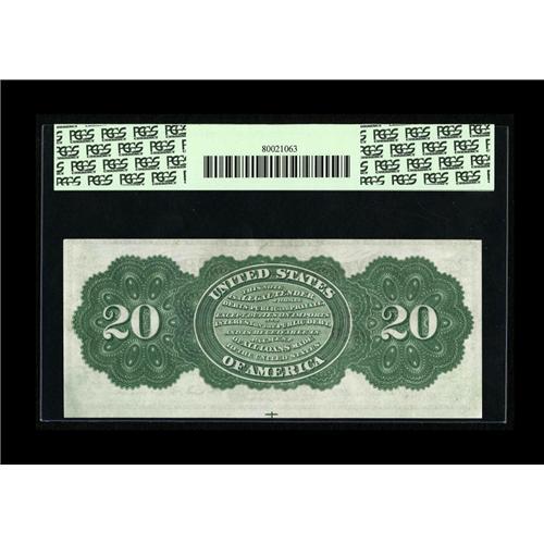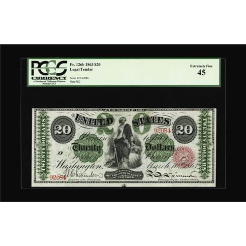 <B>Fr. 126b $20 1863 Legal Tender PCGS Extremely Fine 45.</B></I> Previously part of our 2003 FUN Signature Auction, we described this most pleasing piece, "An absolutely gorgeous piece, with spectacular color and far better margins than we're accustomed to seeing for the type. The back centering is absolutely perfect, the face has just a hair of margin across the top and a huge margin across the bottom. This piece has been auctioned publicly twice before, once as an EF and once as a Choice AU. A beautiful piece." It was our opinion at that time that this was a full About New and now that it is in a third party holder, the fold which accounts for the grade is more or less undetectable.<BR><I>From The Jeffrey L. Olyan Collection, Part 1</B></I>