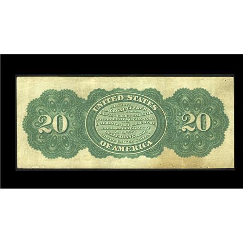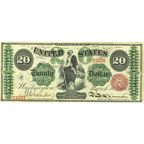 <B>Fr. 126b $20 1863 Legal Tender Very Fine-Extremely Fine.</B></I> Nice surfaces are seen on this early Legal $20. It is new to the census and retains excellent colors. A bright, well margined example worthy of your consideration.<BR><I>From The Plymouth Rock Collection</B></I>