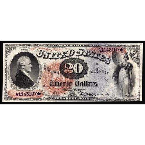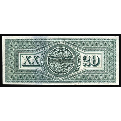 <B>Fr. 127 $20 1869 Legal Tender Choice About New.</B></I> A beautiful Rainbow Twenty that has what may well be the best colors of any example we've handled. The bottom margin is tight at the right, and the note has a very light center fold, but its colors and sharp printing give it the radiant eye appeal of a Superb example.