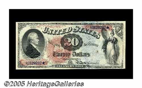 <B>Fr. 127 $20 1869 Legal Tender Gem New.</B></I> Gorgeous Rainbow $20 that was last auctioned in August of 2000 for over $16,000. THis note earned every penny of its price. It is broadly margined with wonderful, original paper surfaces, explosive color and ideal centering of both sides. 1869 $20s in top grade were never easy to come by, and in the last few years, the supply has completely dried up. A note that could easily run well past our estimate.