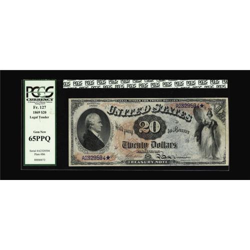 <B>Fr. 127 $20 1869 Legal Tender PCGS Gem New 65PPQ.</B></I> Sold by Stack's in 2001, this gorgeous $20 Rainbow looks to be all of the grade that PCGS has bestowed. Nice back centering and even margins with overwhelming color will certainly propel this example to lofty bidding in the area of...
