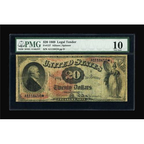 <B>Fr. 127 $20 1869 Legal Tender PMG Very Good 10.</B></I> A pleasing Rainbow that has a few pinholes which are acceptable for the grade.<BR><BR><b>Shipping:</b> Coins & Currency (<a target="_blank" href="http://www.heritageauctions.com/common/shipping.php">view shipping information</a>)