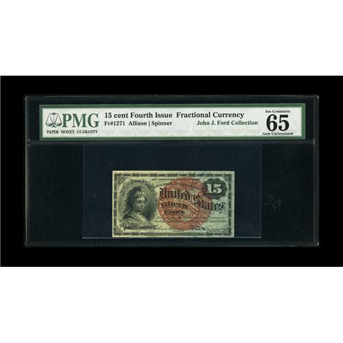 <B>Fr. 1271 15c Fourth Issue PMG Gem Uncirculated 65 EPQ.</B></I> This popular issue is best known for its deep blue color on the right end. Ex: John J. Ford<BR><I>From The Troy Wiseman Collection</B></I>