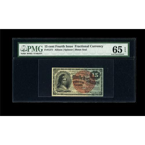<B>Fr. 1271 15c Fourth Issue PMG Gem Uncirculated 65 EPQ.</B></I> Even margins, great color, and excellent eye appeal are some of the qualities this note possesses.<BR><BR><b>Shipping:</b> Coins & Currency (<a target="_blank" href="http://www.heritageauctions.com/common/shipping.php">view shipping information</a>)