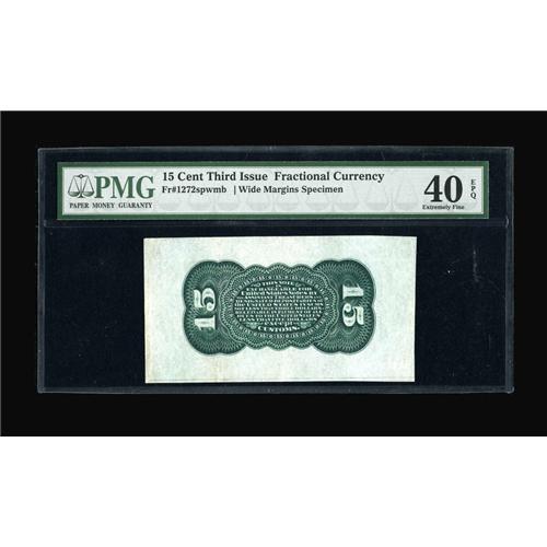 <B>Fr. 1272SP 15¢ Third Issue Wide Margin Back PMG Extremely Fine 40 EPQ.</B></I> This Grant-Sherman Green Back has earned the "Exceptional Paper Quality" appellation.<BR><BR><b>Shipping:</b> Coins & Currency (<a target="_blank" href="http://www.heritageauctions.com/common/shipping.php">view shipping information</a>)