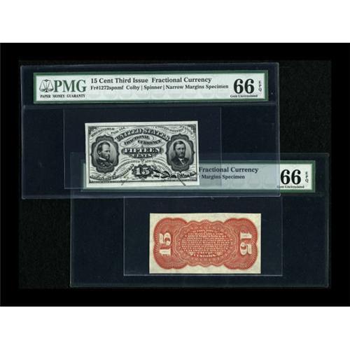 <B>Fr. 1272SP 15c Third Issue Narrow Margin Pair PMG Gem Uncirculated 66 EPQ.</B></I> This perfectly matched pair boasts larger than normal margins on the face. The paper quality and embossing is exceptional. <BR><BR><b>Shipping:</b> Coins & Currency (<a target="_blank" href="http://www.heritageauctions.com/common/shipping.php">view shipping information</a>)