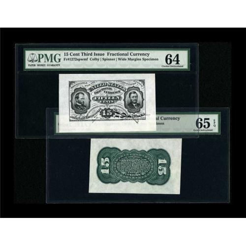<B>Fr. 1272SP 15c Third Issue Wide Margin Pair PMG Choice Uncirculated 64 and 65 EPQ.</B></I> This is a well matched pair despite the one point difference in grade. The Face has all the appearance of a full Gem.<BR><BR><b>Shipping:</b> Coins & Currency (<a target="_blank" href="http://www.heritageauctions.com/common/shipping.php">view shipping information</a>)
