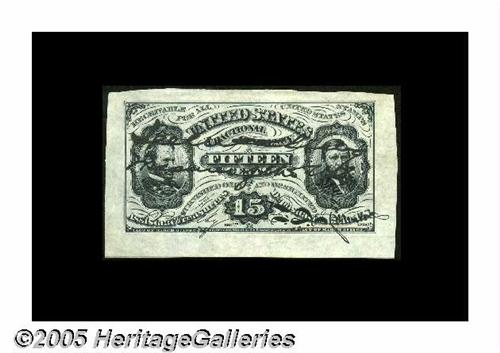<B>Fr. 1272SP Milton 3P15F.1b 15¢ Third Issue Wide Margin Face Courtesy Autograph Choice About New.</B></I> This printed signature Grant-Sherman face bears the bold, dark courtesy autograph, "Lee McClung - Treasurer of the U.S." in two lines, the full width of the note. It's plated on page 95 of Milt's Encyclopedia.