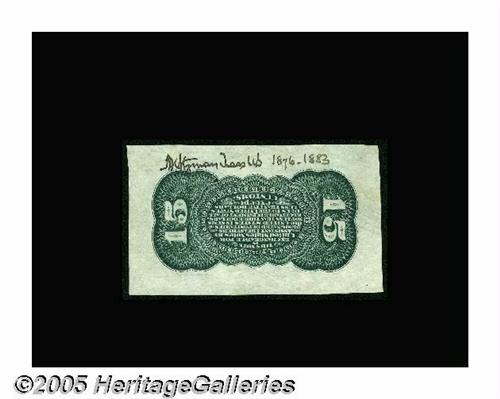 <B>Fr. 1272SP Milton 3P15R.2a 15¢ Third Issue Wide Margin Back Courtesy Autograph Choice About New.</B></I> This Grant-Sherman Green Back grades Gem but for a single light fold. It bears the courtesy autograph, "A.U. Wyman Treas US 1876-1883." The courtesy autograph is inverted at the bottom of the note, apparently done in error by Treasurer Wyman, as the note is easily mistakenly inverted unless one focuses on the central text. This neat courtesy autograph note is plated on page 96 of Milt's Encyclopedia. Milt acquired it on February 12, 1976 from a Quality Sales auction, and Tom acquired it from our January 1997 sale of Milt's collection.