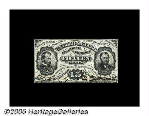 <B>Fr. 1273SP 15¢ Third Issue Narrow Margin Face Gem New.</B></I> Milton 3S15F.2. This is the rare Colby-Spinner signed Grant-Sherman face. It's as nice as any example we've ever seen with its bold signatures and no problems of any kind. These Colby-Spinner signed faces have come off of pink and green shields, which we are sure was the source of this note, although no trace of dismounting remains. It's a bright, well-signed, perfect piece that will likely garner frenzied bidder attention.