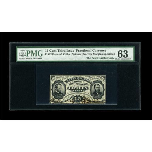 <B>Fr. 1273SP 15¢ Third Issue PMG Choice Uncirculated 63.</B></I> This is a beautiful example of one of the key notes of specimen Fractional, the 15¢ Grant and Sherman Face note with autographed signatures of Colby and Spinner. These specimens were only found on the very rare pink and green Fractional Shields and are Rarity-5 notes, with about 35-40 pieces known. This piece easily is in the top five of the condition census.<BR><I>From The Peter Gamble Collection.</B></I><BR><BR><b>Shipping:</b> Coins & Currency (<a target="_blank" href="http://www.heritageauctions.com/common/shipping.php">view shipping information</a>)