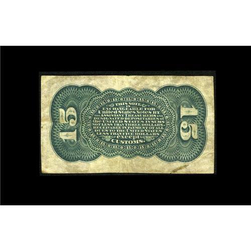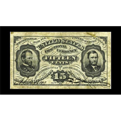 <B>Fr. 1274SP 15c Medium Margin Specimen Pair Third Issue Extremely Fine.</B></I> This is an intriguing medium margin specimen pair with Green Back that has been glued together. The paper surfaces appear somewhat mottled and the upper right corner fold is nearly detached, but there is no doubting the scarcity of the Jeffries-Spinner autograph combination.