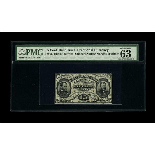 <B>Fr. 1274SP 15c Third Issue Narrow Margin Face PMG Choice Uncirculated 63 EPQ.</B></I> A lovely example of this scarcer hand signed Jeffries-Spinner variety that is boldly printed with the all important portraits of Grant and Sherman.<BR><I>From The Collection of Daniel Weissman</B></I><BR><BR><b>Shipping:</b> Coin/Currency (<a target="_blank" href="http://www.heritageauctions.com/common/shipping.php">view shipping information</a>)