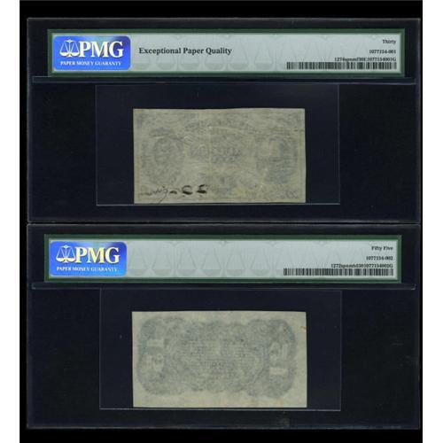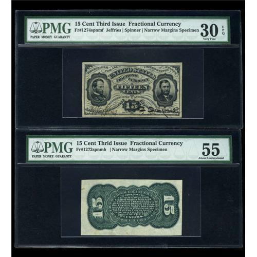 <B>Fr. 1274SP 15c Third Issue Narrow Margins PMG Very Fine 30 EPQ<BR>Fr. 1272SP 15c Third Issue Narrow Margins PMG About Uncirculated 55.</B></I><BR> These Narrow Margin specimens have been cut down from Wide Margin specimens and were not mounted on a Fractional Shield. The face specimen has the scarcer Jeffries-Spinner signature combination. <I>From The Amelia Island Collection.</B></I><BR><BR><b>Shipping:</b> Coins & Currency (<a target="_blank" href="http://www.heritageauctions.com/common/shipping.php">view shipping information</a>)
