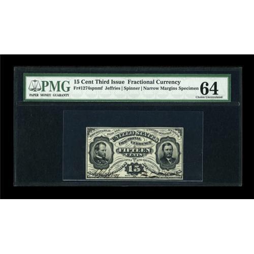<B>Fr. 1274SP 15c Third Issue PMG Choice Uncirculated 64.</B></I> The paper and signatures remain bright on this note which also has suffered from staple holes and rust per comments on the back of the third party holder.<BR><BR><b>Shipping:</b> Coins & Currency (<a target="_blank" href="http://www.heritageauctions.com/common/shipping.php">view shipping information</a>)