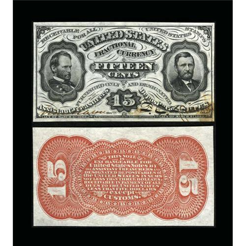 <B>Fr. 1275SP 15¢ Third Issue Narrow Margin Pair Very Choice New.</B></I> The technical grade on this pair would be gem save for the ink smear in Spinner's autograph. Bright, well margined and nicely centered, expect some heated bidding before the hammer finally falls.<BR><BR><b>Shipping:</b> Coins & Currency (<a target="_blank" href="http://www.heritageauctions.com/common/shipping.php">view shipping information</a>)