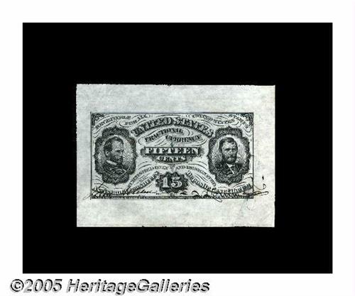 <B>Fr. 1275SP 15¢ Third Issue Wide Margin Face Choice New.</B></I> Milton 3DP15F.1. Considered a die proof by both Friedberg and O'Mara due to its overly large top and bottom margins. The note shows the impression of its plate along the bottom and right. Choice due to some handling, but lovely otherwise with all its original embossing.