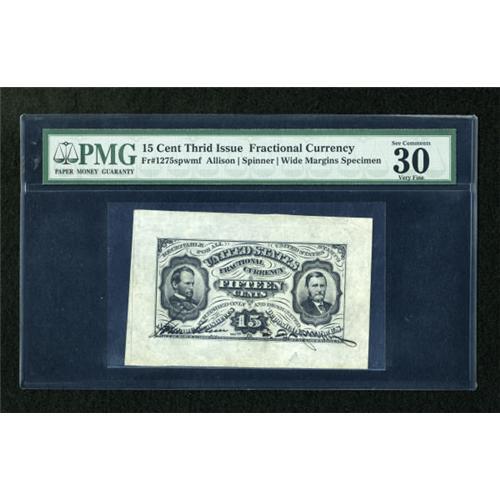 <B>Fr. 1275SP 15c Third Issue Wide Margin Face PMG Very Fine 30 EPQ.</B></I> Light handling and folds are noticed on this well autographed Grant/Sherman face.<BR><BR><b>Shipping:</b> Coins & Currency (<a target="_blank" href="http://www.heritageauctions.com/common/shipping.php">view shipping information</a>)