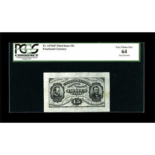 <B>Fr. 1276SP 15¢ Third</B></I> <B>Issue Wide Margin Specimen PCGS Very Choice New 64.</B></I> This wonderful example of an unsigned Grant-Sherman Wide Margin Specimen had spent the last 125+ years in an album put together beginning in the 1870s--an album that contained a number of great things, including a PCGS-67 $5 Educational, several rare Postal Notes, and the two stamp envelopes that also appear in this sale. This finest known example of the now three Fr. 1276SP notes has broad margins all around, perfect print quality, beautiful colors and great eye appeal. It is flawless, save for a very light stain mostly in the margin area to the right of Grant. The far narrower Fr. 1276SP that appeared as lot 1174 of our January 1997 sale of the Milt Friedberg Collection had been considered unique for decades. A second example turned up in the major Fractional collection sold by Stack's last October. That piece realized $16,100. This example, the finest of the now three known, should easily surpass that figure.<BR><BR><b>Shipping:</b> Coins & Currency (<a target="_blank" href="http://www.heritageauctions.com/common/shipping.php">view shipping information</a>)