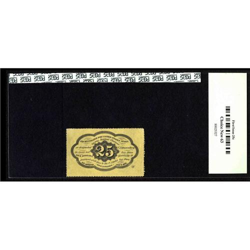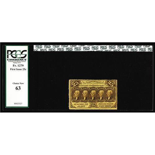 <B>Fr. 1279 25¢ First Issue PCGS 63.</B></I> The perfs are a little close across the top on this fully perforated note which likely accounts for the Choice grade, as the note appears Gem in every other respect.