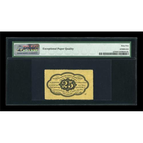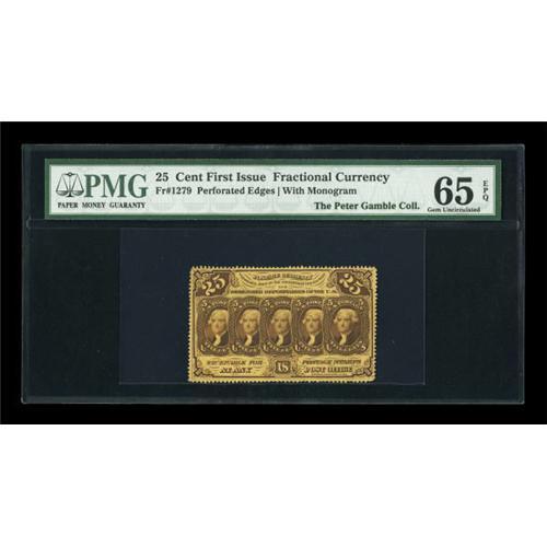 <B>Fr. 1279 25¢ First Issue PMG Gem Uncirculated 65 EPQ.</B></I> The original embossing is easily seen on this fully perforated First Issue 25¢ note. The colors are perfect and the EPQ comment is well earned. <BR><I>From The Peter Gamble Collection.</B></I><BR><BR><b>Shipping:</b> Coins & Currency (<a target="_blank" href="http://www.heritageauctions.com/common/shipping.php">view shipping information</a>)