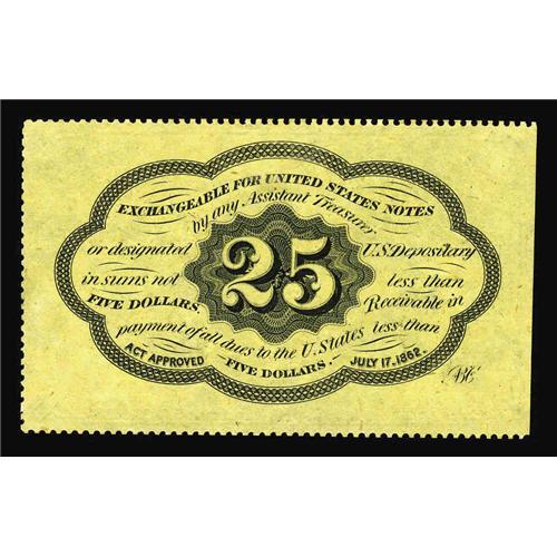 <B>Fr. 1279 25c First Issue Gem New.</B></I> The perforated margins on this note are solid and the paper is perfect. Additionally, the front to back centering is almost ideal.