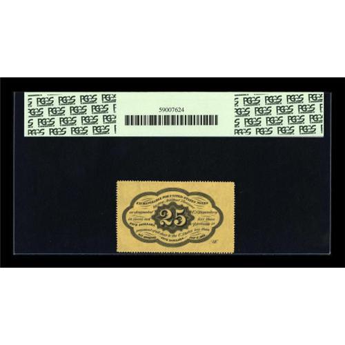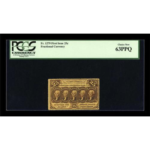 <B>Fr. 1279 25c First Issue PCGS Choice New 63PPQ.</B></I> This is a pleasing example with the perforations cut in along the right side.<BR><BR><b>Shipping:</b> Coins & Currency (<a target="_blank" href="http://www.heritageauctions.com/common/shipping.php">view shipping information</a>)