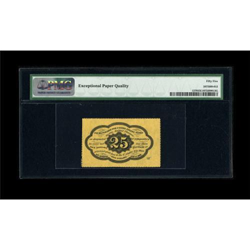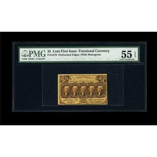 <B>Fr. 1279 25c First Issue PMG About Uncirculated 55 EPQ.</B></I> The perfs are cut into the design at right on this bright note.<BR><BR><b>Shipping:</b> Coins & Currency (<a target="_blank" href="http://www.heritageauctions.com/common/shipping.php">view shipping information</a>)