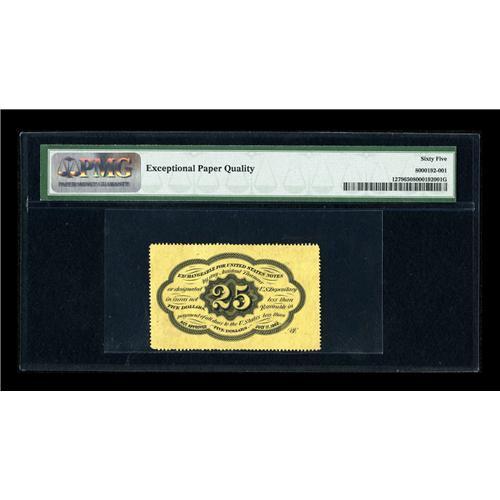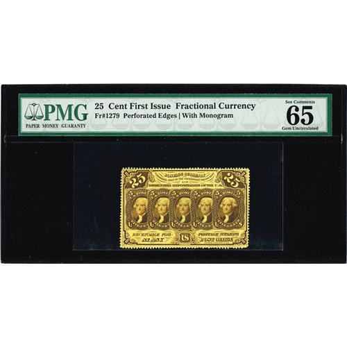 <B>Fr. 1279 25c First Issue PMG Gem Uncirculated 65 EPQ.</B></I> The bright and richly colored printing adds to the unadulterated paper on this Monogrammed issue.