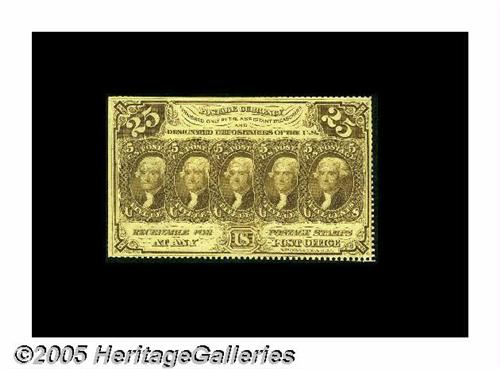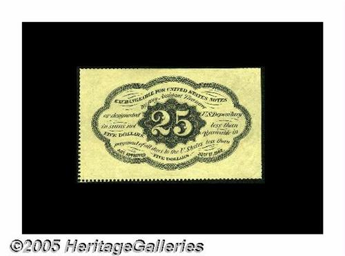 <B>Fr. 1280 25¢ First Issue Choice New.</B></I> A crisply original First Issue 25¢ no-monogram variety. The relief impression of a paper clip from past storage is present. But for the fact that the perforations have been trimmed on two sides, this attractive note would be a full Gem.