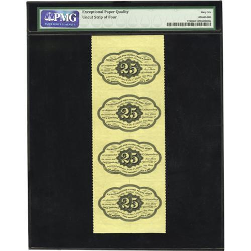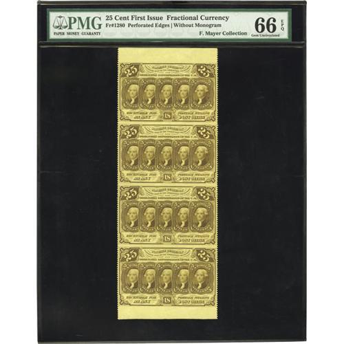 <B>Fr. 1280 25¢ First Issue Vertical Strip of Four PMG Gem Uncirculated 66 EPQ.</B></I> When we last sold this item, it was as Lot 57 of the Mike Marchioni Collection, where it was also graded Gem, in January of 2000. It was described there, "This fascinating strip is perforated only on the left and right vertical margins, but not horizontally. Each of the four notes is a perfect Gem in its own right, and the strip itself, with its top and bottom selvage wholly intact, has incredible eye appeal. This has been one of the prized items in Mike's Collection for over two decades, and tonight it will find a home with another collector who should and probably will prize it just as highly." At that sale, it achieved the runaway price of $7700. (7500-up)<BR><I>From The Frederick Mayer Collection</B></I><BR><BR><b>Shipping:</b> Coins & Currency (<a target="_blank" href="http://www.heritageauctions.com/common/shipping.php">view shipping information</a>)
