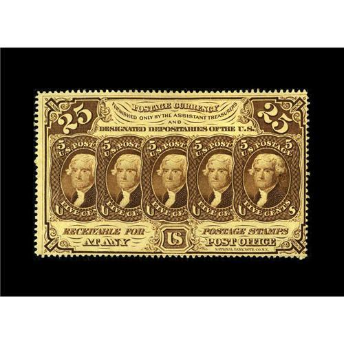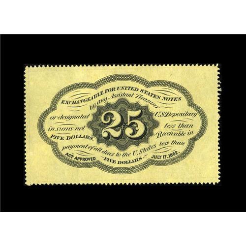 <B>Fr. 1280 25¢ First Issue Very Choice New.</B></I> A near Gem example of this much tougher, no-monogram perforated note. The perforations are deep and even all the way around, and the note would be Superb if the bottom and right margins were as broad as the top and left. The back is perfectly centered.<BR><BR><b>Shipping:</b> Coins & Currency (<a target="_blank" href="http://www.heritageauctions.com/common/shipping.php">view shipping information</a>)