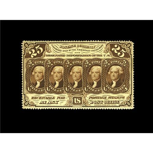 <B>Fr. 1280 25c First Issue Choice About New.</B></I> Perforations are found on all four sides of this scarce note that carries chocolate brown ink on yellow paper. Fr. 1280s are up to 30 times scarcer than Fr. 1279s. A faint fold is found on this perforated without-monogram type.