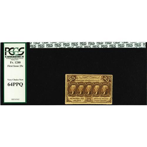 <B>Fr. 1280 25c First Issue PCGS Very Choice New 64PPQ.</B></I> This First Issue note is apparently kept from the full Gem grade by face centering.