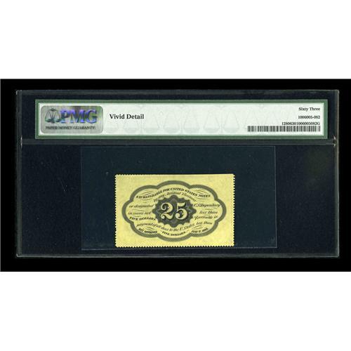 <B>Fr. 1280 25¢ First Issue PMG Choice Uncirculated 63.</B></I> A richly colored perforated example of the no monogram variety that would likely have been classified as a full Gem with more complete perforations at top. PMG also comments, "Vivid Detail."