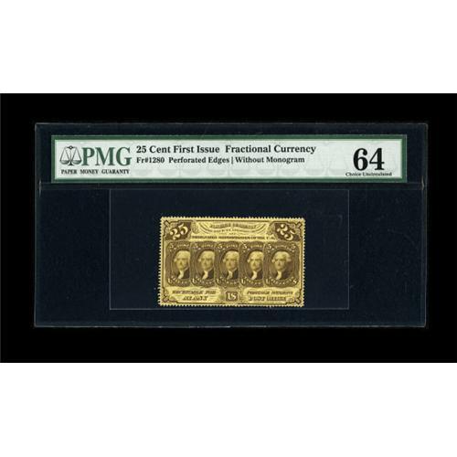 <B>Fr. 1280 25c First Issue PMG Choice Uncirculated 64.</B></I> The color is quite pleasing and the perforations strong on this without monogram example.<BR><BR><b>Shipping:</b> Coins & Currency (<a target="_blank" href="http://www.heritageauctions.com/common/shipping.php">view shipping information</a>)
