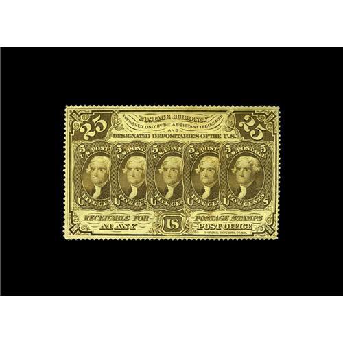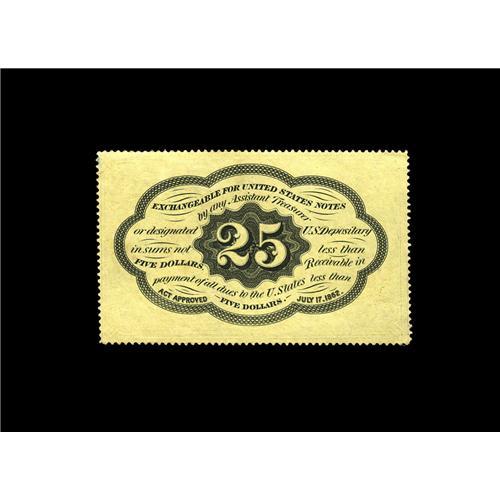 <B>Fr. 1280 25c First Issue Very Choice New.</B></I> Deep and original embossing is clearly evident on this much scarcer no monogram note. Healthy margins and deep perforations only lend credence to the grade.