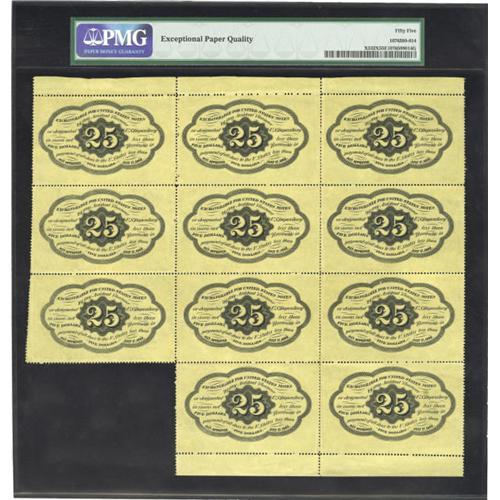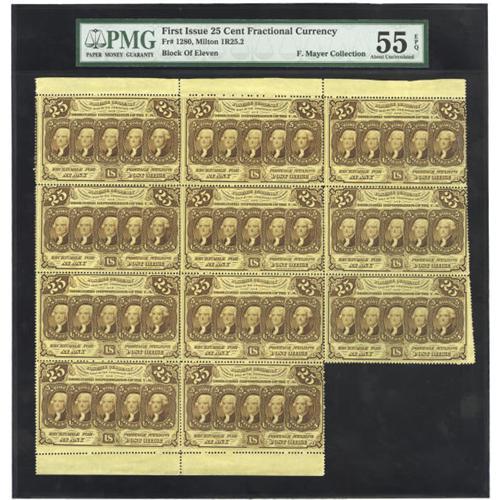 <B>Fr. 1280 Milton 1R25.2 25¢ First Issue Block of Eleven PMG 55 EPQ.</B></I> Mr. Mayer acquired this extremely rare "no motto" perforated multiple as Lot 498 of CAA's January 1997 Milt Friedberg Collection sale. We described it there, "Fr. 1280 is a very scarce note in its own right, and multiples are even more so. When perforated multiples are seen, they are generally just barely hanging together. This magnificent block is a wonderful exception. All eleven notes hang tightly along their perforations, without even a hint of a split. The colors are bright, and the notes are beautifully fresh. Taken individually, nine of the eleven notes would grade fully Gem but for their centering, which is a bit varied, as these rows of perforations are less than perfectly straight. This is one of the most important multiples in Milt's landmark collection, and it will make a wonderful prize for the collector lucky enough to take it home." At that sale, where it was also graded About New, it realized $2645, an extremely strong price for ten years ago on an evening when Fractional collectors' budgets were stretched to the breaking point! On the current market, the eleven individual notes would be worth far more than double the price paid for the block in 1997. We would not be at all surprised if this irreplaceable item reached or exceeded... (10,000-up)<BR><I>From the Currency Auctions of America January 10, 1997 Milt Friedberg Sale, Lot 498. Previously Lot 2024 from Bowers & Ruddy's Russell sale, June 20, 1977. Previously Lot 1133 of the H.R. Harmer June 10, 1968 auction.<BR>From The Frederick Mayer Collection</B></I><BR><BR><b>Shipping:</b> Coins & Currency (<a target="_blank" href="http://www.heritageauctions.com/common/shipping.php">view shipping information</a>)