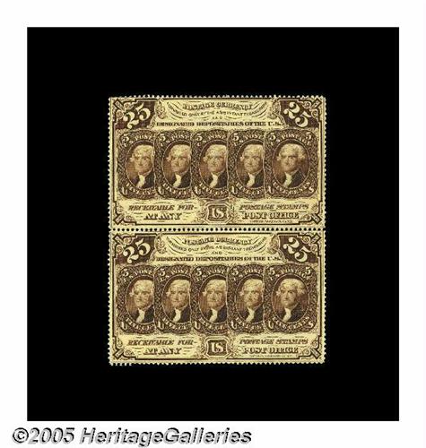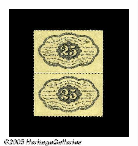 <B>Fr. 1280 Milton 1R25.2b 25¢ First Issue Vertical Pair Choice New.</B></I> A very tough number and truly rare as a multiple. It's an item that many Fractional Collectors will never get the opportunity to own, not as a matter of cost, but simply due to the fact that it can be decades between appearances of perforated multiples.