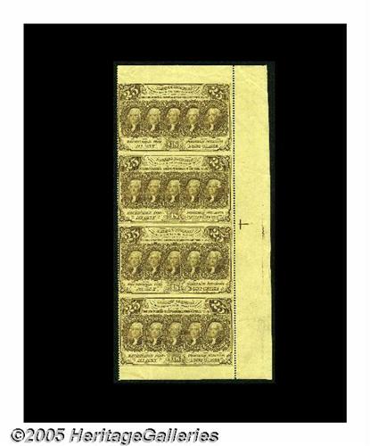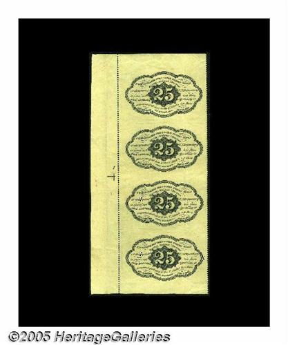 <B>Fr. 1280 Milton 1R25.2e 25¢ First Issue Vertical Strip of Four About New.</B></I> Fr. 1280 is a very scarce note in its own right, and multiples are even more so. This particular piece likely owes its survival to its having been perforated in one direction only. There is a horizontal fold that runs through all four notes about an inch from the left edge. The piece is beautifully bright, with the typical light yellow paper that is almost always associated with this Friedberg number. This is the type of item that is missing from all but the most advanced Fractional collections.