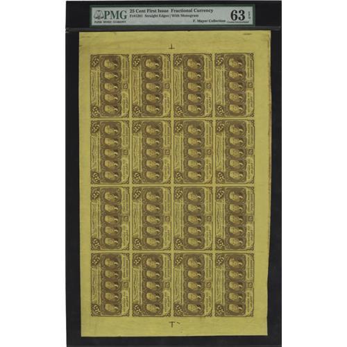 <B>Fr. 1281 25¢ First Issue Complete Sheet of Sixteen PMG Choice Uncirculated 63 EPQ.</B></I> This gorgeous sheet is separated from the Gem grade by a few handling marks and light corner folds that do not approach any of the lovely notes. It's fresh, fully bright and 100% original. An outstanding quality sheet. (5000-up)<BR><I>From The Frederick Mayer Collection</B></I><BR><BR><b>Shipping:</b> Coins & Currency (<a target="_blank" href="http://www.heritageauctions.com/common/shipping.php">view shipping information</a>)