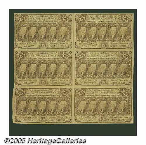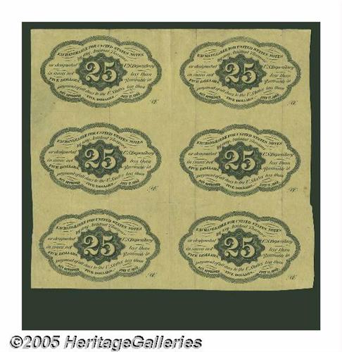 <B>Fr. 1281 25¢ First Issue Uncut Block Of Six Very Fine.</B></I> Lightly circulated as a dollar-fifty piece. Bright and attractive with the appearence of About New notes from the face.