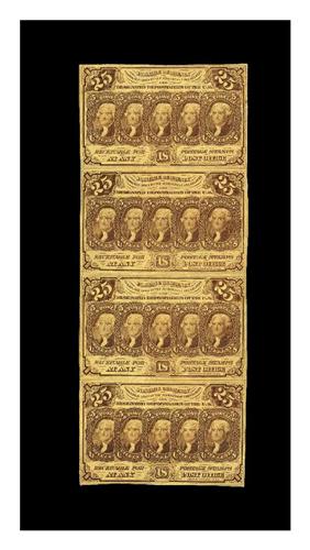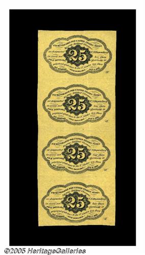 <B>Fr. 1281 25¢ First Issue Vertical Strip Of Four About New.</B></I> A light vertical fold lowers the grade on this otherwise Gem strip. A bright and most attractive one dollar bill.