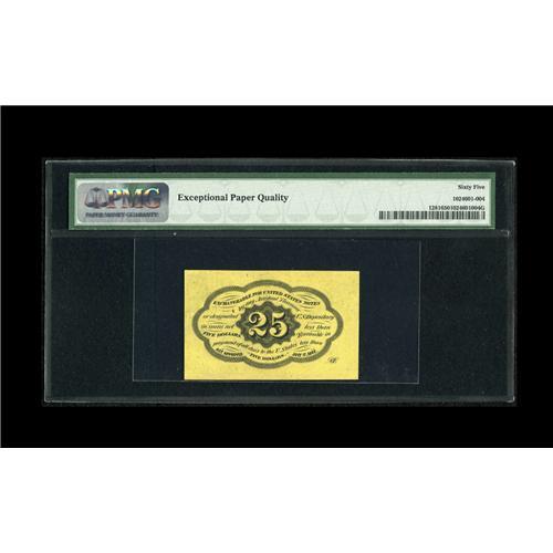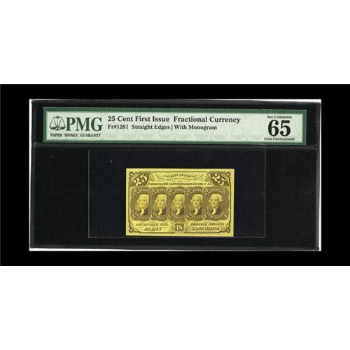 <B>Fr. 1281 25c First Issue PMG Gem Uncirculated 65.</B></I> "Exceptional Paper Quality" is an additional comment added to the holder by the certification firm. Their claim is verifiable even through the surfaces of the encapsulation.