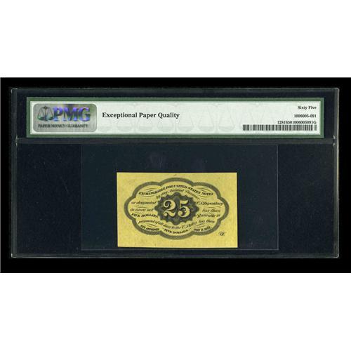<B>Fr. 1281 25c First Issue PMG Gem Uncirculated 65.</B></I> "Exceptional Paper Quality" is an additional comment added to the holder by the certification firm. Their claim is verifiable even through the surfaces of the encapsulation.